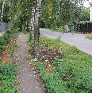 г. Балашиха, мкрн. Нокольско-Архангельский, ул. Александровская д. 22 (на фото справа), который выбросил строительный мусор в водосточную канаву, проходящюю по улице Александровская, а в частности вдоль забора моего дома (на фото слева от асфальтовой дорожки), тем самым засорив прилегающую территорию и перекрыв сток грунтовых и дождевых вод, что может привести к подтоплению моего участка. На замечания и просьбу убрать мусор и очистить канаву, он никак не отреагировал.