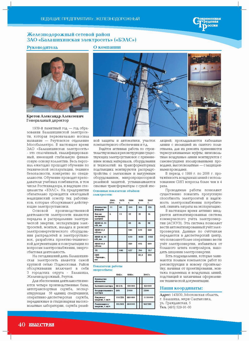 1939-й памятный год — год образования Балашихинской электросети, которая первоначально носила название — Реутовское отделение Мособлэлектро. В настоящее время ЗАО «Балашихинская электросеть» - это сплочённый, квалифицированный, имеющий стабильную финансовую основу коллектив. Весь персонал ежегодно проходит обучение по технической эксплуатации, технике безопасности, конкретно по специальности. Обучение проводят преподаватели учебных комбинатов, в том числе Ростехнадзора, и ведущие специалисты «БЭЛС». На предприятии обязательно проводится ежегодный медицинский осмотр тех работников, которые обслуживают действующие электроустановки.