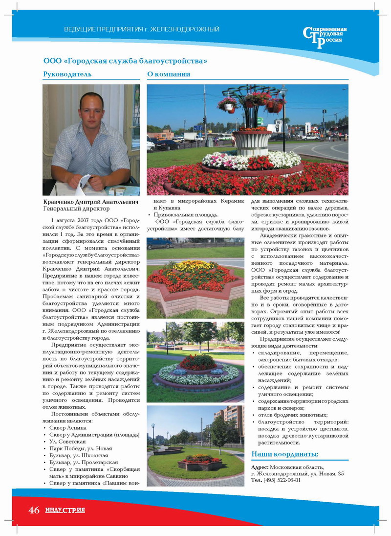 1 августа 2007 года ООО «Городской службе благоустройства» исполнился 1 год. За это время в организации сформировался сплочённый коллектив. С момента основания «Городскую службу благоустройства» возглавляет генеральный директор Кравченко Дмитрий Анатольевич. Предприятие в нашем городе известное, потому что на его плечах лежит забота о чистоте и красоте города. Проблемам санитарной очистки и благоустройства уделяется много внимания. ООО «Городская служба благоустройства» является постоянным подрядчиком Администрации г. Железнодорожный по озеленению и благоустройству города.