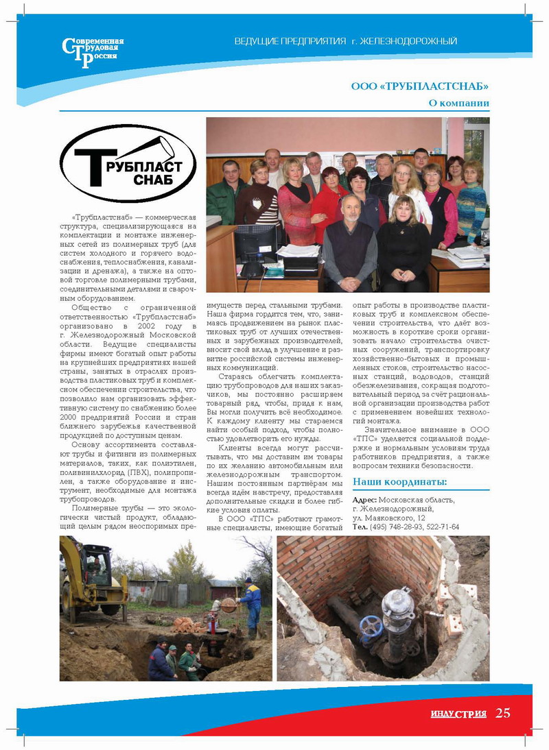 В ООО «ТПС» работают грамотные специалисты, имеющие богатый опыт работы в производстве пластиковых труб и комплексном обеспечении строительства, что даёт возможность в короткие сроки организовать начало строительства очистных сооружений, транспортировку хозяйственнобытовых и промышленных стоков, строительство насосных станций, водоводов, станций обезжелезивания, сокращая подготовительный период за счёт рациональной организации производства работ с применением новейших технологий монтажа.