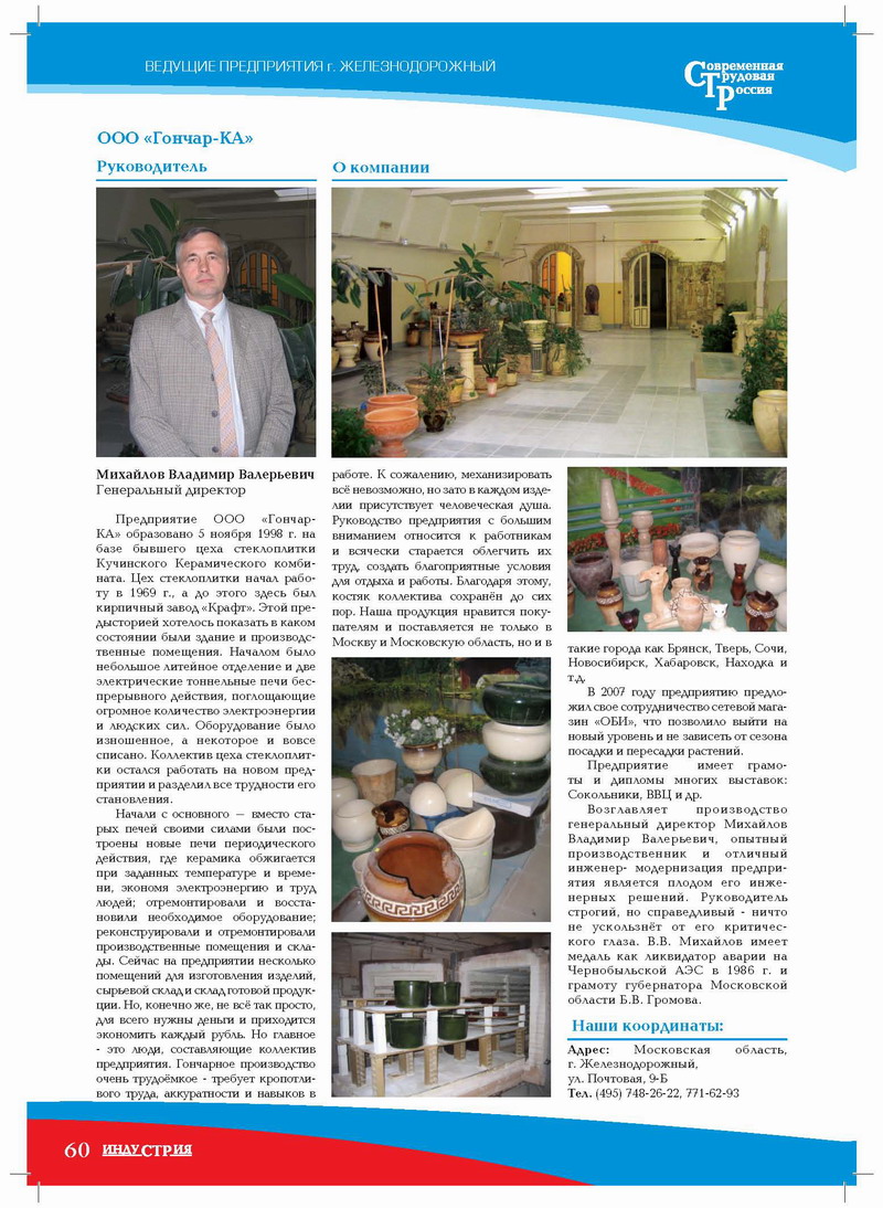 Начали с основного – вместо старых печей своими силами были построены новые печи периодического действия, где керамика обжигается при заданных температуре и времени, экономя электроэнергию и труд людей; отремонтировали и восстановили необходимое оборудование; реконструировали и отремонтировали производственные помещения и склады. Сейчас на предприятии несколько помещений для изготовления изделий, сырьевой склад и склад готовой продукции. Но, конечно же, не всё так просто, для всего нужны деньги и приходится экономить каждый рубль. Но главное - это люди, составляющие коллектив предприятия. Гончарное производство очень трудоёмкое - требует кропотливого труда, аккуратности и навыков в работе. К сожалению, механизировать всё невозможно, но зато в каждом изделии присутствует человеческая душа. Руководство предприятия с большим вниманием относится к работникам и всячески старается облегчить их труд, создать благоприятные условия для отдыха и работы. Благодаря этому, костяк коллектива сохранён до сих пор. Наша продукция нравится покупателям и поставляется не только в Москву и Московскую область, но и в такие города как Брянск, Тверь, Сочи, Новосибирск, Хабаровск, Находка и т.д.