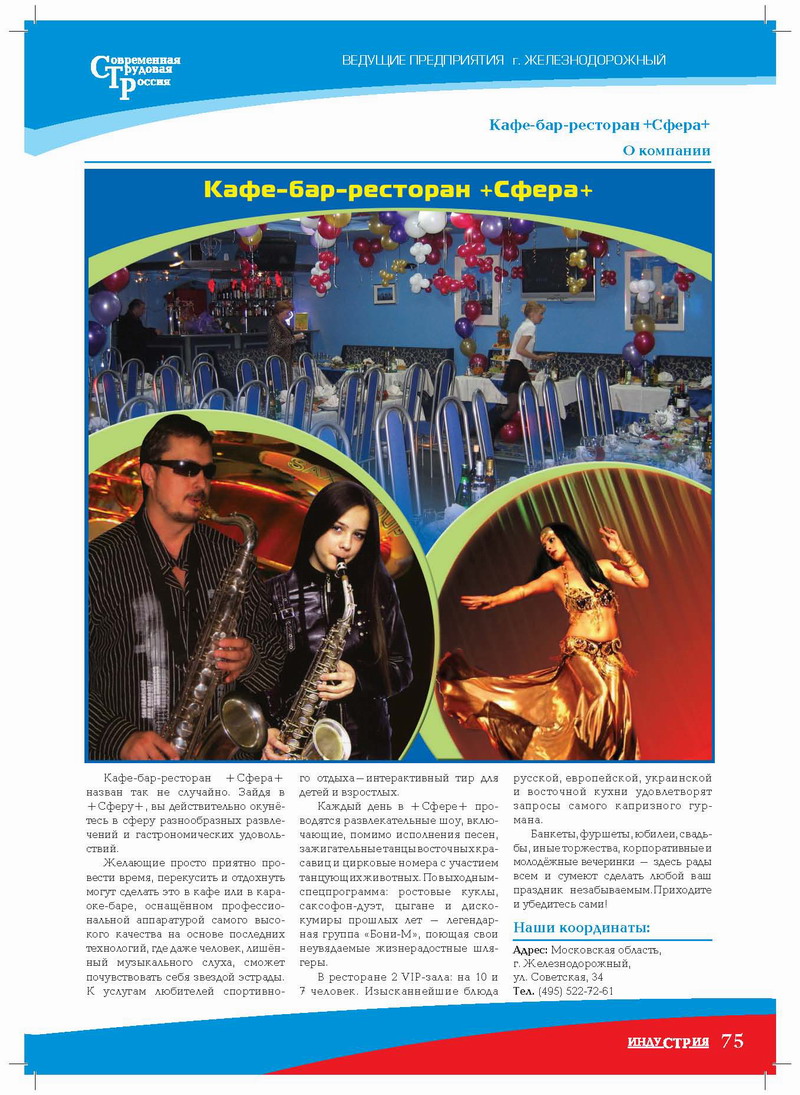 Кафе-бар-ресторан +Сфера+ назван так не случайно. Зайдя в +Сферу+, вы действительно окунётесь в сферу разнообразных развлечений и гастрономических удовольствий.
