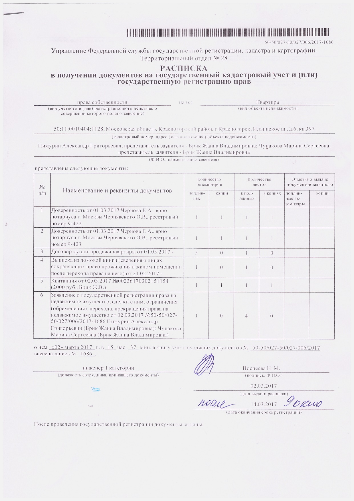 Добрый день! Хотела узнать судьбу, поданных документов на регистрацию права на квартиру. Подавала 02.03.2017 г. Должна была и получить готовые документы 14.03.2017 г. Но мне никто не может дать вразумительный ответ, почему они не готовы. Будь так добры ответить на мой вопрос, и когда я могу получить готовые, зарегистрированные документы. Благодарю!