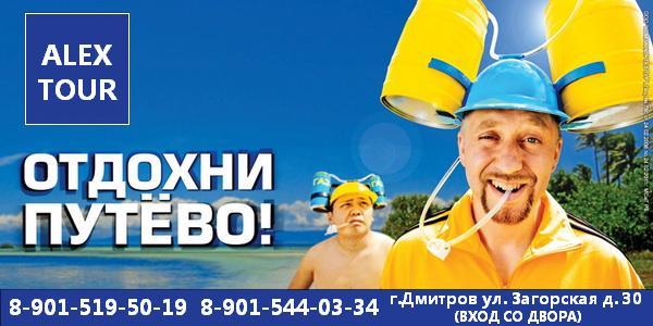 25 октября 2012 г.Уже 2-й год отдыхаем с Алекс-Туром и всегда оставались, очень довольны. С уверенностью можно сказать, что это лучшее агентство в Дмитрове. Отдельное спасибо Алексею. Всегда помогает подобрать именно то, что нужно, честно рассказывает информацию об отелях, очень много рассказывает о стране и дает полезные советы. Отличное агентство, на другое не променяем!