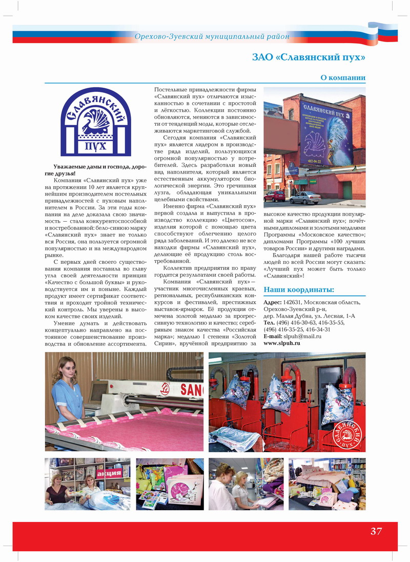 Компания «Славянский пух» уже на протяжении 10 лет является крупнейшим производителем постельных принадлежностей с пуховым наполнителем в России. За эти годы компания на деле доказала свою значимость – стала конкурентоспособной и востребованной: белосинюю марку «Славянский пух» знает не только вся Россия, она пользуется огромной популярностью и на международном рынке.