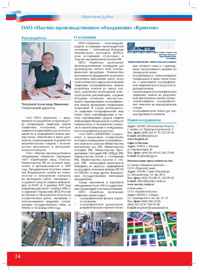 НПО «Криптен» – член международной ассоциации производителей голограмм – International Hologram Manufacturers Association (IHMA), член ассоциации «Союзупак» и Торговопромышленной палаты РФ.