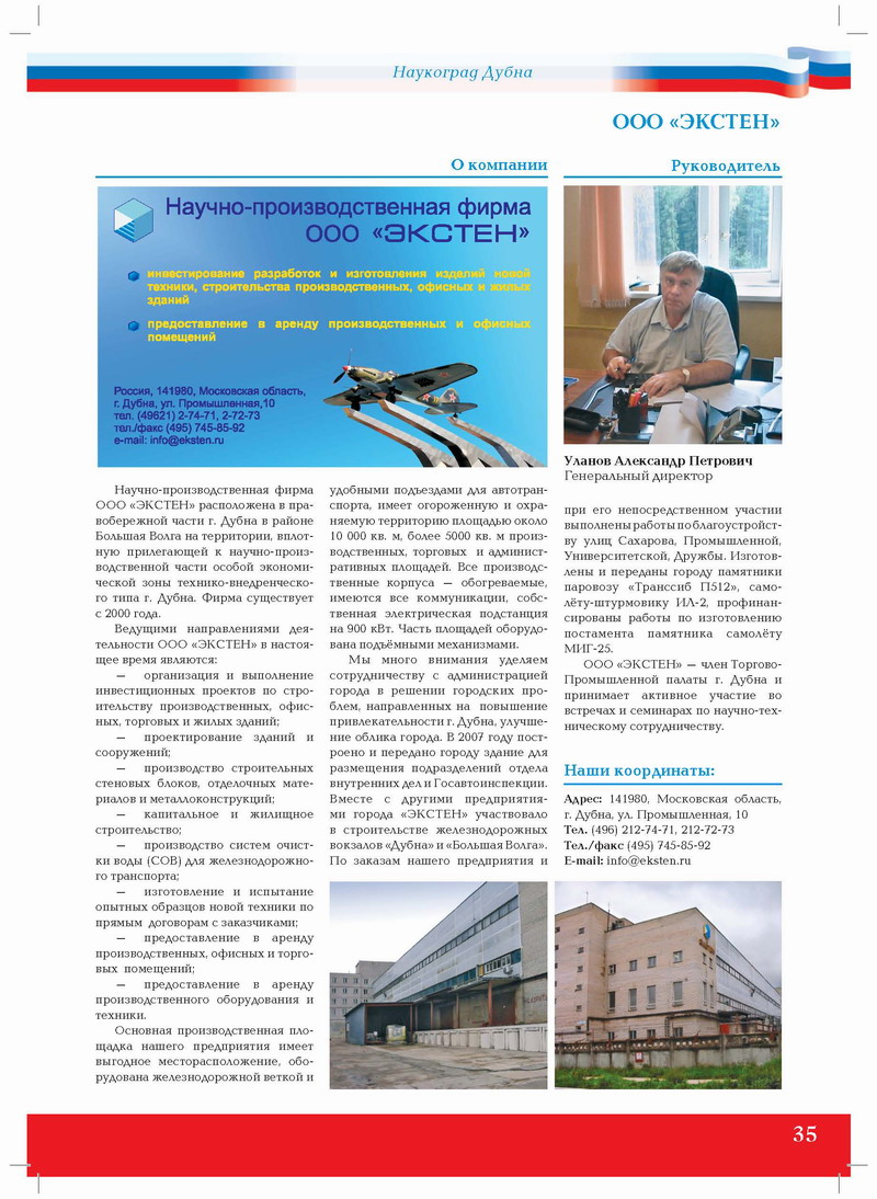 Научно-производственная фирма ООО «ЭКСТЕН» расположена в правобережной части г. Дубна в районе Большая Волга на территории, вплотную прилегающей к научно-производственной части особой экономической зоны техниковнедренческого типа г. Дубна. Фирма существует с 2000 года.