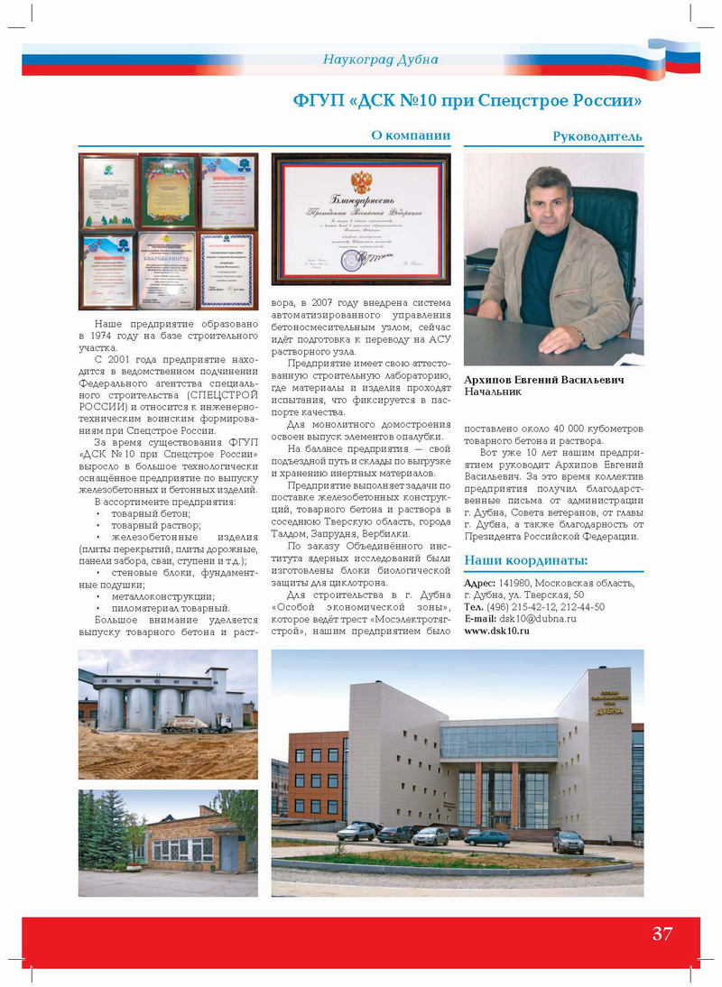 За время существования ФГУП «ДСК № 10 при Спецстрое России» выросло в большое технологически оснащённое предприятие по выпуску железобетонных и бетонных изделий.