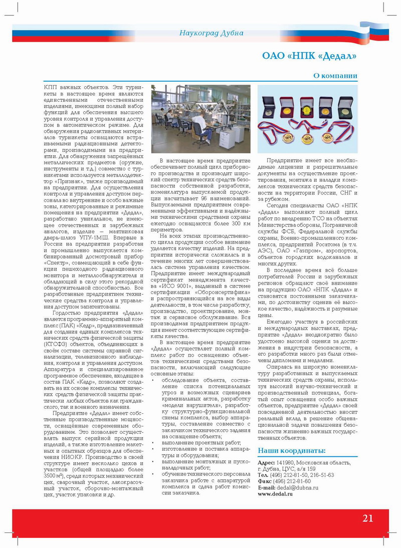 Другое направление разработок – технические средства контроля и управления доступом на людских и транспортных контрольнопропускных пунктах. Для организации контроля и управления доступом разработан комплекс аппаратных и программных средств, реализующий передовые перспективные технологии. Основными техническими средствами комплекса являются устройства преграждающие управляемые, досмотровое оборудование, автоматизированный автотранспортный КПП. На предприятии созданы полноростовые турникеты УПУ-1РШ (одиночный) и УПУ-2РШ (сдвоенный) для оснащения людских КПП важных объектов. Эти турникеты в настоящее время являются единственными отечественными изделиями, имеющими полный набор функций для обеспечения высшего уровня контроля и управления доступом в автоматическом режиме. Для обнаружения радиоактивных материалов турникеты оснащаются встраиваемыми радиационными детекторами, производимыми на предприятии. Для обнаружения запрещённых металлических предметов (оружие, инструменты и т.д.) совместно с турникетами используется металлодетектор «Признак», также производимый на предприятии. Для осуществления контроля и управления доступом персонала во внутренние и особо важные зоны, категорированные и режимные помещения на предприятии «Дедал», разработано уникальное, не имеющее отечественных и зарубежных аналогов, изделие – маятниковая дверь-шлюз УПУ-1МШ. Впервые в России на предприятии разработан и промышленно выпускается комбинированный досмотровый прибор «Спектр», совмещающий в себе функции пешеходного радиационного монитора и металлообнаружителя и обладающий в силу этого рекордной обнаружительной способностью. Все разработанные предприятием технические средства контроля и управления доступом запатентованы.