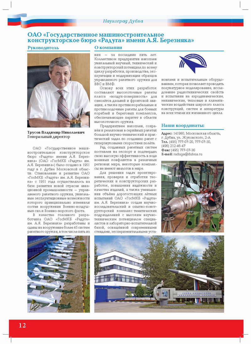 ОАО «Государственное машиностроительное конструкторское бюро «Радуга» имени А.Я. Березняка» (ОАО «ГосМКБ «Радуга» им. А.Я. Березняка») было создано в 1951 году в г. Дубне Московской области. Становление и развитие ОАО «ГосМКБ «Радуга» им. А.Я. Бе резняка» с 1951 года осуществлялось на базе развития новой отрасли авиационной промышленности – управляемого ракетного оружия, уникальные эксплуатационные возможности которого принципиально изменили состав вооружения Военновоздушных сил и Военноморского флота.