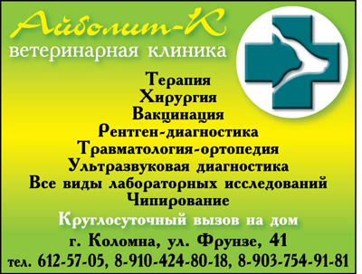 9 апреля 2011 г.Хочу поблагодарить - Евгению Юрьевну и Оксану Борисовну, за свою собаку. Ее сильно покусала собака бойцовской породы без хозяина, мы были с ней в других клиниках и везде нам сказали, что не надо мучить, надо усыпить. Евгения Юрьевна не отказалась от нас и взяла на операцию, еще до операции у Малыша, стали отекать легкие, угроза смерти была. В последующие после операции дни, врачи боролись с отеком и, спасибо им, справились, мы идем на поправку и уже бегаем! Страшно подумать, что могли усыпить члена семьи. Спасибо, Вам "Айболит-К"!