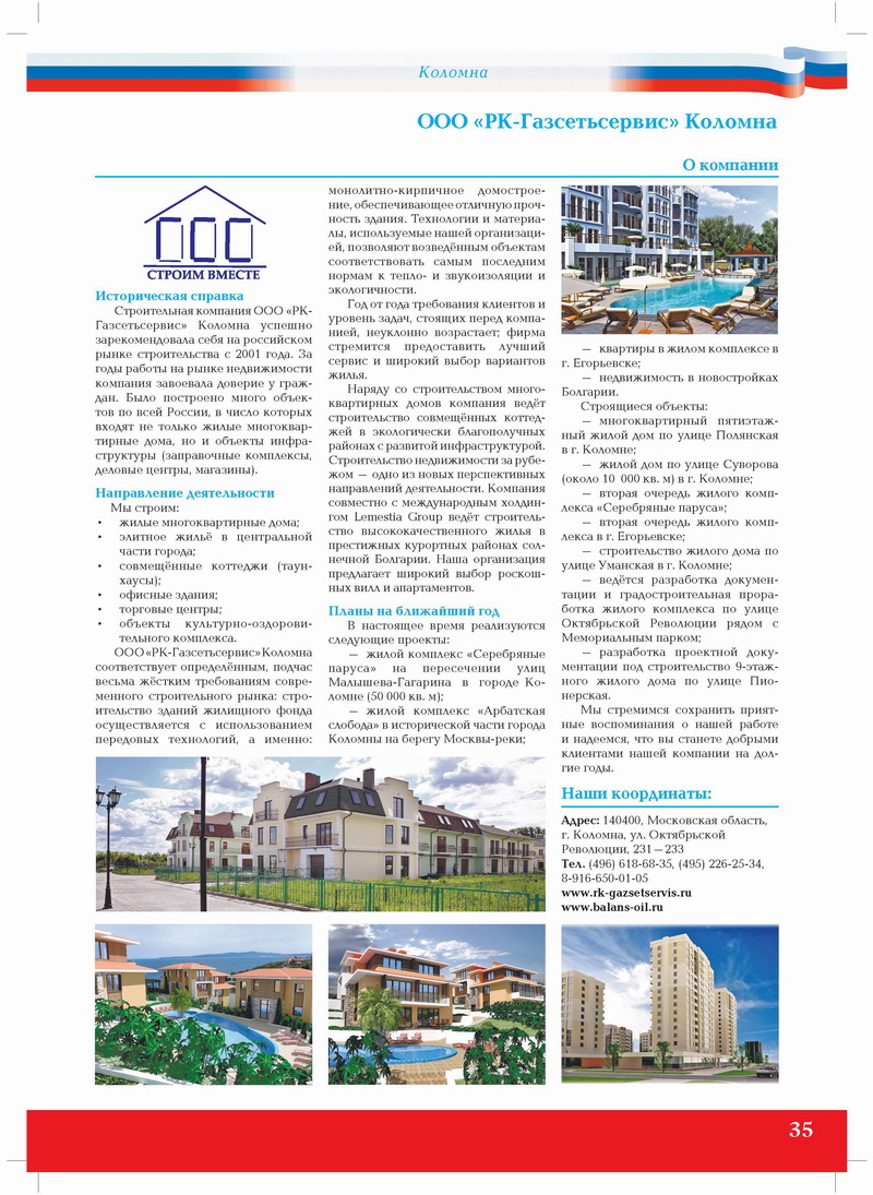Строительная компания ООО «РК-Газсетьсервис» Коломна успешно зарекомендовала себя на российском рынке строительства с 2001 года. За годы работы на рынке недвижимости компания завоевала доверие у граждан. Было построено много объектов по всей России, в число которых входят не только жилые многоквартирные дома, но и объекты инфраструктуры (заправочные комплексы, деловые центры, магазины).