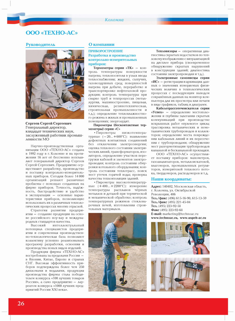 Научно-производственная организация ООО «ТЕХНОАС» создана в 1992 году в г. Коломне и на протяжении 16 лет её бессменно возглавляет генеральный директор Сергеев Сергей Сергеевич. Предприятие осуществляет разработку, производство и поставку контрольно-измерительных приборов. Сегодня более 14 000 организаций решают различные проблемы с помощью созданных на фирме приборов. Точность, надёжность, быстродействие и удобство в эксплуатации – основные характеристики приборов, позволяющие использовать их в различных технологических процессах многих отраслей.