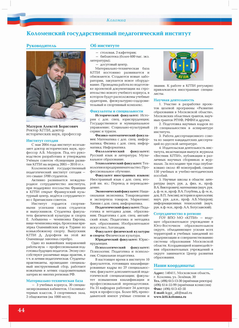 ГОУ ВПО МО «КГПИ» – ведущее образовательное учреждение в Юго-Восточном образовательном округе, объединяющее усилия всех территорий и учебных заведений по модернизации и совершенствованию системы образования Московской области. Координацией взаимодействия образовательных учреждений в округе занимается Центр развития образования.