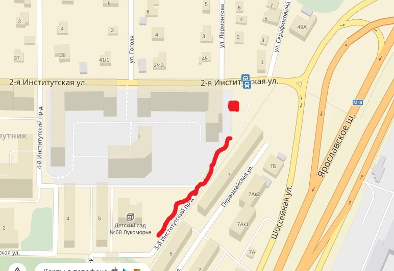Здравствуйте. Может, это Ваша территория, но всё же напишу. На карте точкой показано, где было 6-7 собак, лают на проходящих мимо людей. Линией обозначено возможная зона обитания, так как приблизительно с той улицы тоже иногда слышен лай стаи. Примите, пожалуйста, меры или передайте коллегам в г. Мытищи. Спасибо.