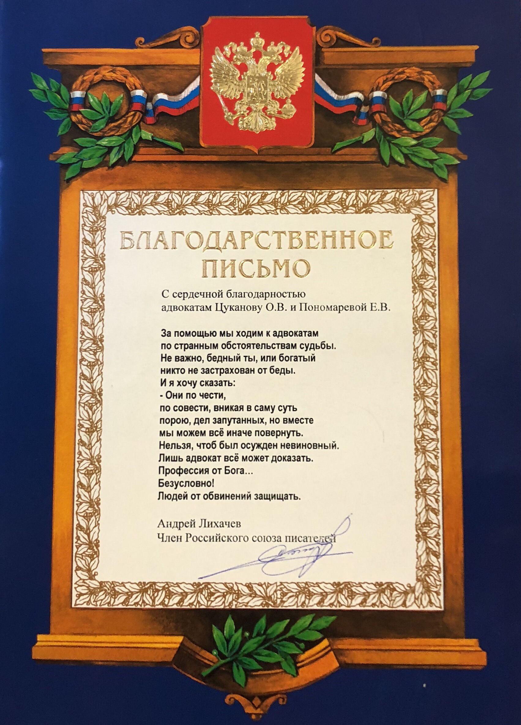 Сердечно благодарю адвоката Цуканова О.В. и Пономареву Е.В. за профессионализм, за помощь и добросовестное отношение!
