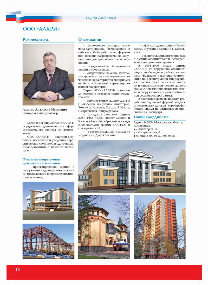 В 2001-2006 годах фирма «АЛКРИ» по поручению администрации Люберецкого района выполняла функцию заказчиказастройщика по реконструкции микрорайона Красная горка со сносом ветхого и строительством нового жилого фонда с новыми инженерными сетями и сооружениями, в рамках областной социальной программы.