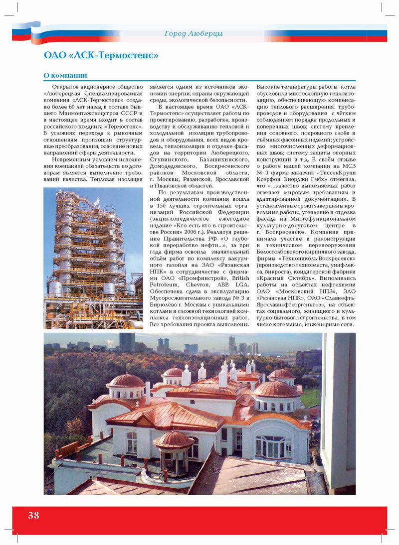 В настоящее время ОАО «ЛСК-Термостепс» осуществляет работы по проектированию, разработке, производству и обслуживанию тепловой и холодильной изоляции трубопроводов и оборудования, всех видов кровель, теплоизоляции и отделке фасадов на территории Люберецкого, Ступинского, Балашихинского, Домодедовского, Воскресенского районов Московской области, г. Москвы, Рязанской, Ярославской и Ивановской областей.