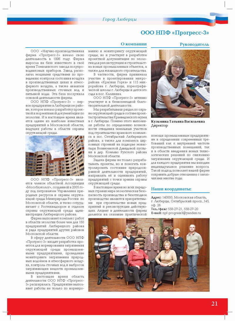 ООО НПФ «Прогресс-3» – первое предприятие в Люберецком районе, которое начало разработку проектной и нормативной документации по экологии. И в настоящее время является одним из наиболее известных предприятий в Московской области, ведущих работы в области охраны окружающей среды.