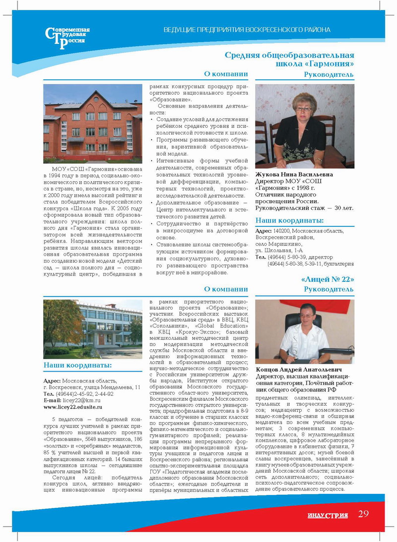 МОУ «СОШ «Гармония» основана в 1994 году в период социально-экономического и политического кризиса в стране, но, несмотря на это, уже к 2000 году имела высокий рейтинг и стала победителем Всероссийского конкурса «Школа года». К 2005 году сформировала новый тип образовательного учреждения: школа полного дня «Гармония» стала организатором всей жизнедеятельности ребёнка. Направляющим вектором развития школы явилась инновационная образовательная программа по созданию новой модели «Детский сад – школа полного дня – социокультурный центр», победившая в рамках конкурсных процедур приоритетного национального проекта «Образование».