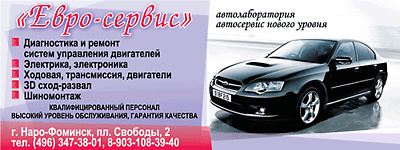 27 сентября 2016 г.Что Вы делаете, когда нужно очень срочно ехать где-то км 300 от Нары, а в авто что-то не работает? Правильно… Ищете автосервис в котором помогут «здесь и сейчас». Я тоже искала, утром, в воскресенье, нужно было проверить электропроводку от авто к прицепу (все выведено, а при соединении вилки пропадала масса). Нашла этот, так сказать «автосервис», мне сказали (главное кто сказал – Роман Болдырев (Генеральный директор), так мне его представили работники автосервиса). «ДА, за 4 часа и 3 тыс.руб. все сделаем!» В 10:30 ч отдала авто, прицеп, стала ждать 4 часа, в 15:30 ч. узнаю что никто, ни чего с моим авто не делал и делать не собирается «у нас много работы, мы не успеваем, и сегодня точно уже вам ни чего не сделаем….» - ответили мне мастера. Звоню Роману на два разных номера, а нет его «АБОНЕНТ НЕ ДОСТУПЕН, попробуйте позвоните…» ОДНИМ СЛОВОМ - «КИНУЛИ». Конечно «летала» по Наре, нашла другой сервис, за 30 мин. Все прозвонили, устранили проблему и стоило это в 5 раз дешевле. В итоге пришлось ехать «в ночь». ЕСЛИ ВАМ ДОРОГИ ВАШИ НЕРВЫ, ВРЕМЯ И ДЕНЬГИ СОВЕТУЮ ВАМ ОБХОДИТЬ СТОРОНОЙ ДАННОЕ ЗАВЕДЕНИЕ ПОД НАЗВАНИЕМ «ЕВРО-СЕРВИС».