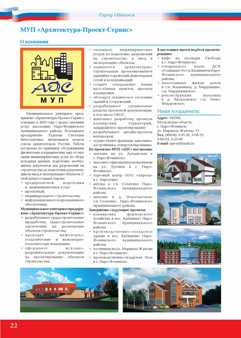 По проектам МУП «АПС» построены: магазин на ул. Латышская в г. Наро-Фоминске; магазин с офисными помещениями на ул. Луговая в г. Наро-Фоминске; торговый центр ООО «Апрель» в г. Апрелевке; аптека в г.п. Селятино Наро-Фоминского муниципального района; магазин в д. Новоглаголево г.п. Селятино Наро-Фоминского муниципального района.