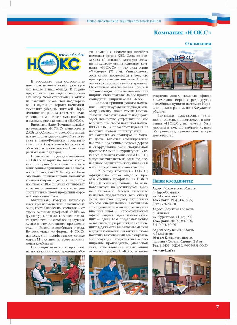 В 2005 году компания «Н.ОК. С» официально стала лидером продаж оконных профилей из ПВХ в Наро-Фоминском районе. Но останавливаться на достигнутом здесь не собираются. Сегодня вниманию клиентов предлагается весь спектр услуг, включая отделку внутренних откосов специальными пластиковыми сэндвичпанелями и герметизация внешних швов. В нарофоминском офисе открыт отдел комплектующих – здесь вам предложат новые детали взамен утерянных или сломавшихся, даже если вы заказывали окна в другой компании. Вы также можете посетить выставочный зал с образцами продукции. В перспективе – расширение производства, дилерской сети, использование новых линий оконных профилей «КВЕ», а также открытие дополнительных офисов в Селятино, Верее и ряде других населённых пунктов не только Наро-Фоминского района, но и Калужской области.