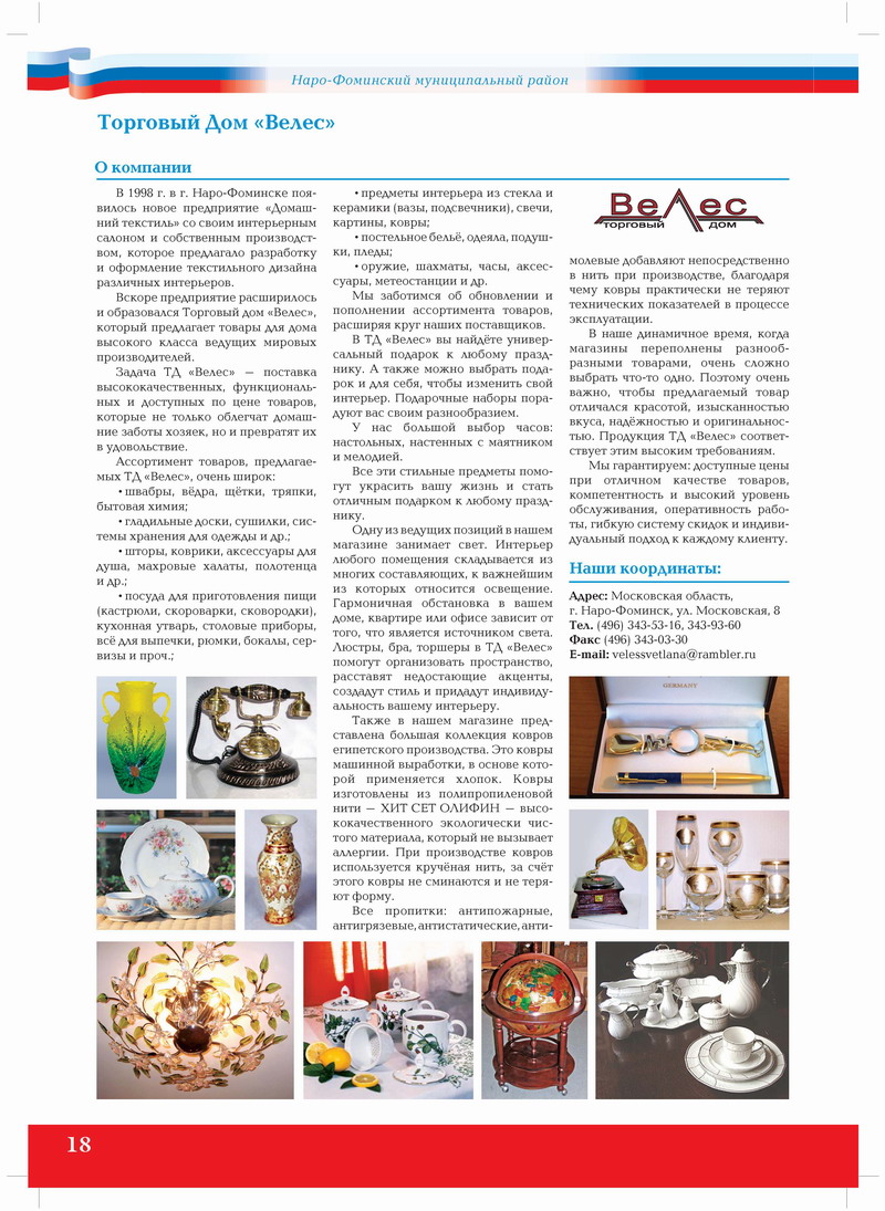 В наше динамичное время, когда магазины переполнены разнообразными товарами, очень сложно выбрать что-то одно. Поэтому очень важно, чтобы предлагаемый товар отличался красотой, изысканностью вкуса, надёжностью и оригинальностью. Продукция ТД «Велес» соответст вует этим высоким требованиям.