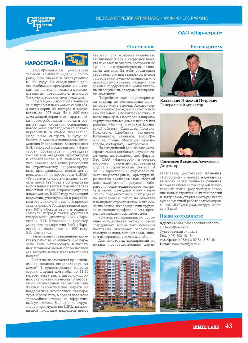 С 1969 года «Нарострой» занимался выпуском жилых домов серии 464, а затем серии 90, которая и выпускалась до 1997 года. Но с 1997 года дома данной серии стали практически невостребованными, тогда и возникла идея создания совершенно нового дома. Этот год можно назвать переломным в судьбе коллектива. Надо было смотреть в будущее. Вместе с главным технологом объединения Московского домостроения В.Н. Тяжловой представители «Наростроя» обратились к президенту Российской академии архитектуры и строительства А.Р. Рочегову, где уже имелись кое-какие разработки по строительству широко корпусных, принципиально новых домов повышенной комфортности (ШКД). «Умную мысль» достали из ящика стола и зимой 1997 года в 30-градусный мороз начали выпуск хорошо теперь известной серии широко корпусных жилых домов. В 2002 году творческий коллектив, участвующий в разработке и осуществлении данного проекта стал лауреатом Государственной премии РФ в области науки и техники. Высокой награды также удостоены генеральный директор ОАО «Нарострой» Н.П. Казакевич и директор дочернего предприятия ЗАО «Нарострой-1», созданного в 1997 году, В.А. Савченков.