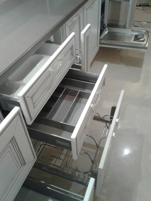Для примера выдвинул ящики внизу: теперь не просто деревянный короб, там может быть все что угодно! В первый жена положила ложки-вилки, во второй лопаточки и мелочевку типа крышек от баночек, а в самом низу кастрюли, с крышками. Такое расположение упрощает поиск, удобно пользоваться, красиво. Супруга рада и мне приятно, такой подарок ей на День Рождение сделал! Старший сын сказал, что «мама плакала украдкой от радости..» :) Я благодарен производителю, понял что классическая кухня тоже может быть модной.