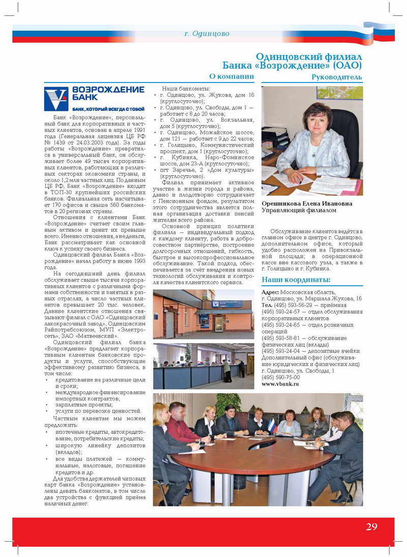 Одинцовский филиал Банка «Возрож дение» начал работу в июне 1993 года.