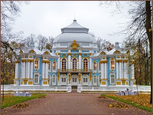 Павильон «Эрмитаж» расположен в Эрмитажной роще Екатерининского парка, в селе в полукилометре от Екатерининского дворца. Павильон был построен по заказу императрицы Елизаветы Петровны в стиле барокко, первоначально спроектированный архитектором М. Г. Земцовым. К закладке первого камня приступили