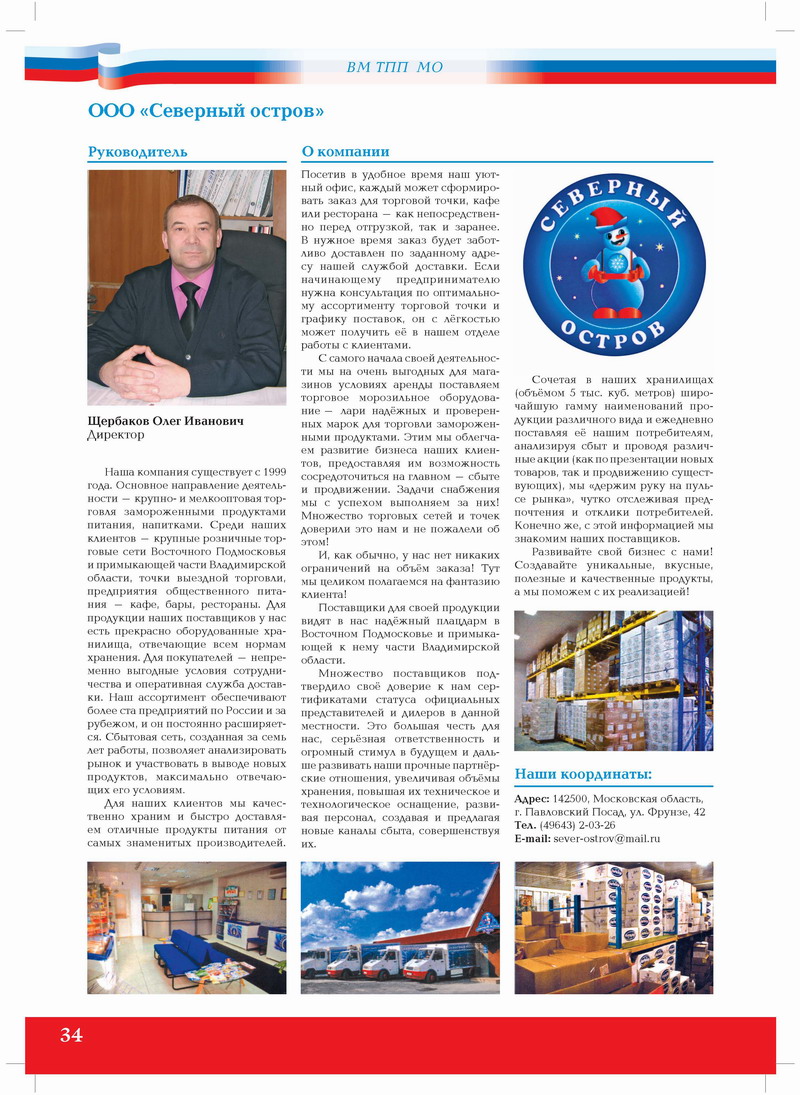 Наша компания существует с 1999 года. Основное направление деятельности – крупно- и мелкооптовая торговля замороженными продуктами питания, напитками. Среди наших клиентов – крупные розничные торговые сети Восточного Подмосковья и примыкающей части Владимирской области, точки выездной торговли, предприятия общественного питания – кафе, бары, рестораны. Для продукции наших поставщиков у нас есть прекрасно оборудованные хранилища, отвечающие всем нормам хранения. Для покупателей – непременно выгодные условия сотрудничества и оперативная служба доставки. Наш ассортимент обеспечивают более ста предприятий по России и за рубежом, и он постоянно расширяется. Сбытовая сеть, созданная за семь лет работы, позволяет анализировать рынок и участвовать в выводе новых продуктов, максимально отвечающих его условиям.
