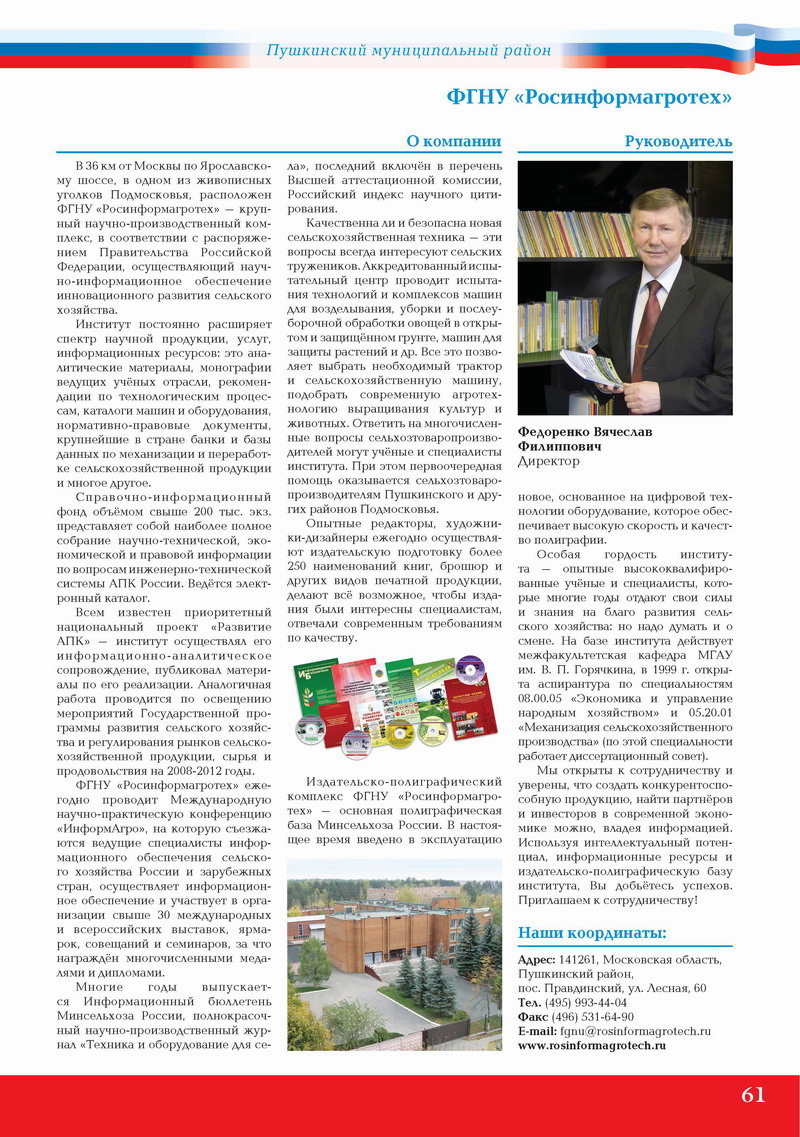 В 36 км от Москвы по Ярославскому шоссе, в одном из живописных уголков Подмосковья, расположен ФГНУ «Росинформагротех» – крупный научно-производственный комплекс, в соответствии с распоряжением Правительства Российской Федерации, осуществляющий научно-информационное обеспечение инновационного развития сельского хозяйства.