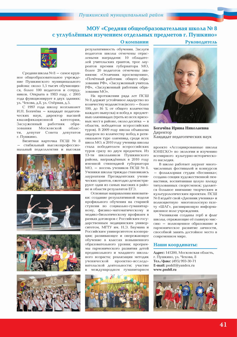 Средняя школа № 8 – самое крупное общеобразовательное учреждение Пушкинского муниципального района: около 1,5 тысяч обучающихся, более 100 педагогов и сотрудников. Открыта в 1983 году, с 2005 года функционирует в двух зданиях: ул. Чехова, д.8, ул. Озёрная, д.5. С 1997 года школу возглавляет И.Н. Богачёва – кандидат педагогических наук, директор высшей квалификационной категории, Заслуженный работник образования Московской области, депутат Совета депутатов г. Пушкино.