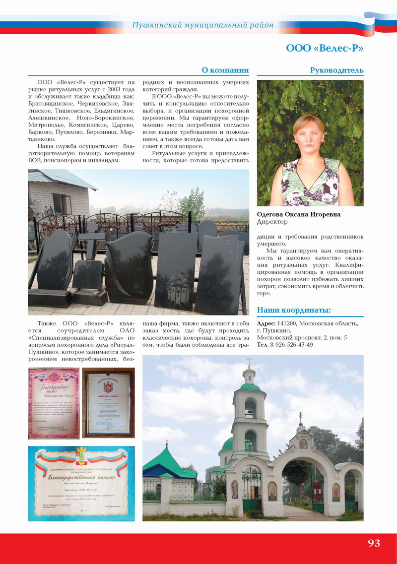 Также ООО «Велес-Р» является соучредителем ОАО «Специализированная служба» по вопросам похоронного дела «Ритуал-Пушкино», которое занимается захоронением невостребованных, безродных и неопознанных умерших категорий граждан.