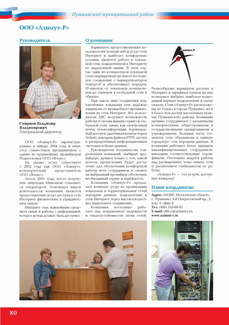 ООО «Азимут-Р» зарегистрировано в январе 2004 года и является совместным предприятием с одним из крупнейших провайдеров Подмосковья ООО «Флекс».