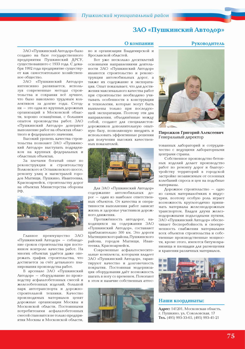 ЗАО «Пушкинский Автодор» интенсивно развивается, используя современные методы строительства и сохраняя всё лучшее, что было накоплено трудовым коллективом за долгие годы. Сегодня – это одна из крупных дорожных организаций в Московской области, хорошо оснащённая, с большим опытом производства работ. ЗАО «Пушкинский Автодор» доверяют выполнение работ на объектах областного и федерального значения.