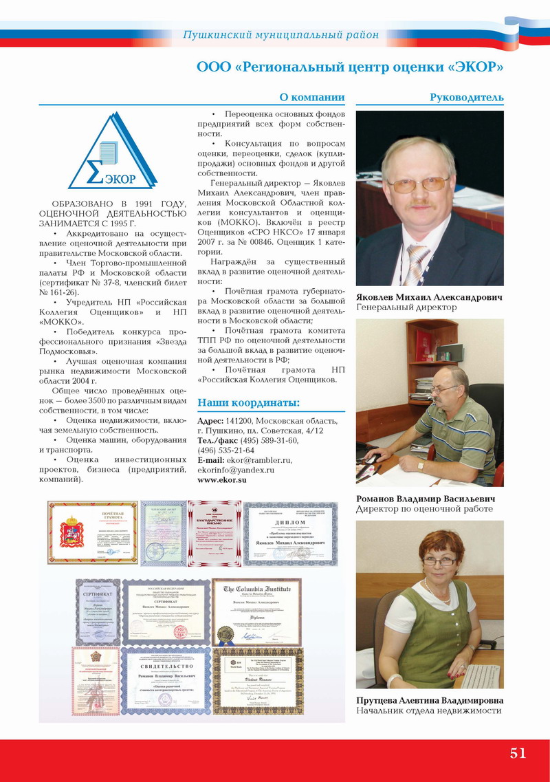Генеральный директор – Яковлев Михаил Александрович, член правления Московской Областной коллегии консультантов и оценщиков (МОККО). Включён в реестр Оценщиков «СРО НКСО» 17 января 2007 г. за № 00846. Оценщик 1 категории.