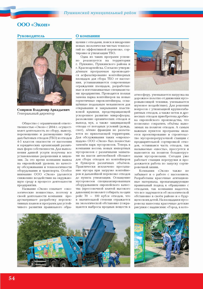Общество с ограниченной ответственностью «Экон» с 2004 г. осуществляет деятельность по сбору, вывозу, перемещению и размещению твёрдых бытовых отходов (ТБО) и отходов 4-5 классов опасности от населения и юридических организаций различных форм собственности. Для выполнения данной услуги получены все установленные разрешения и лицензии. За это время компания вышла на европейский уровень по качеству обслуживания и технологичности оборудования и транспорта. Особое внимание ООО «Экон» уделяется снижению воздействия на окружающую среду в процессе деятельности предприятия.