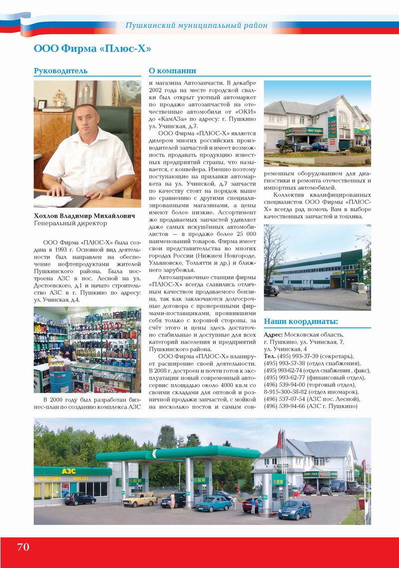 ООО Фирма «ПЛЮС-Х» была создана в 1993 г. Основной вид деятельности был направлен на обеспечение нефтепродуктами жителей Пушкинского района. Была построена АЗС в пос. Лесной на ул. Достоевского, д.1 и начато строительство АЗС в г. Пушкино по адресу: