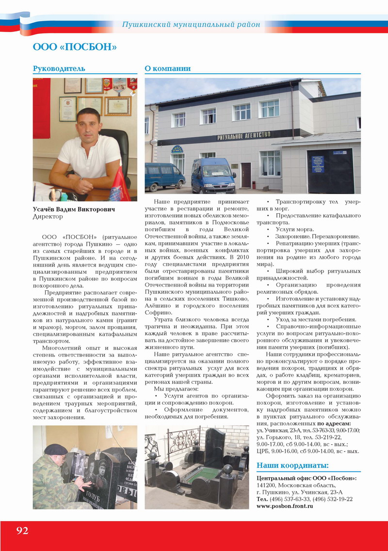 ООО «ПОСБОН» (ритуальное агентство) города Пушкино – одно из самых старейших в городе и в Пушкинском районе. И на сегодняшний день является ведущим специализированным предприятием в Пушкинском районе по вопросам похоронного дела.