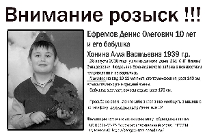 д. Федосьино, Волоколамского района, ушли в неизвестном направлении жители г. Москвы: пенсионерка Хонина Алла Васильевна 1939 года рождения и ее десятилетний внук Ефремов Денис Олегович 2000 года рождения, рост: 140 см: лицо: овальное, волосы: короткие прямые светлые; прическа: фасонная, ушные раковины: оттопыренные; глаза: светлые; размер обуви: 39.