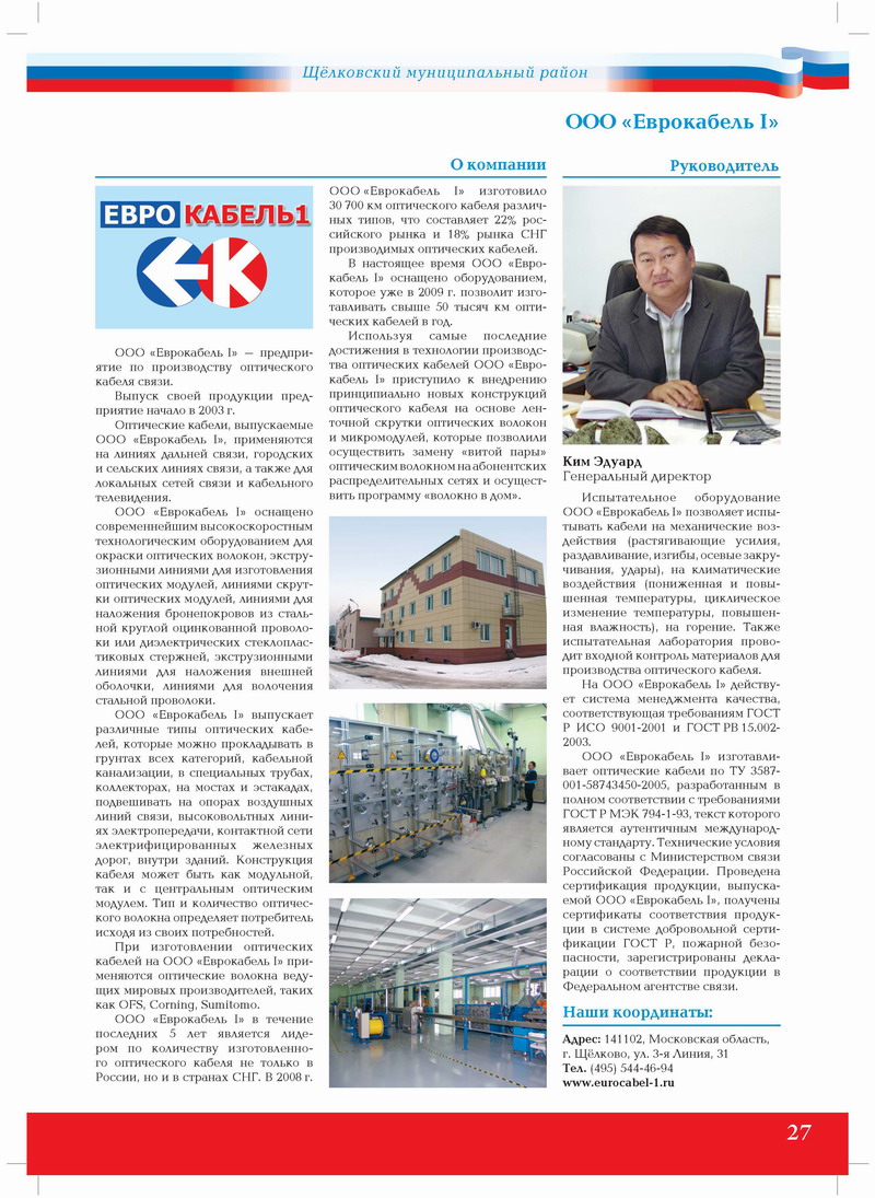 ООО «Еврокабель I» – предприятие по производству оптического кабеля связи.