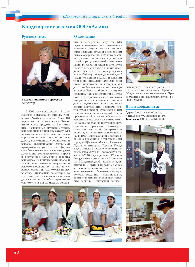 В 2009 году исполнилось 12 лет с момента образования фирмы. Компания «Лакби» производит более 100 видов тортов и пирожных. Также имеем честь предложить Вам элитные, изысканные авторские торты, выполненные по Вашему заказу. Мы называем наши заказные торты авторскими, так как это поистине шедевры, выполненные специалистами высокой квалификации. Основными приоритетами руководство фирмы «Лакби» считает максимальное удовлетворение покупательского спроса и постоянное повышение качества выпускаемых кондитерских изделий за счёт использования натурального высококачественного сырья и совершенствования технологии производства. Уникальные рецептуры, по которым приготовлены все наши изделия, сочетают в себе современные технологии и новые модные тенденции кондитерского искусства. Мы рады предложить вам утончённые свадебные торты, которые отличаются изысканностью и европейским стилем оформления. У Вашего ребёнка праздник – закажите у нас детский торт, украшенный разноцветными фигурками: такой торт сможет сделать веселей любой детский праздник. Нужен торт ко дню рождения или любой другой праздничной дате? Подарите Вашим родным и близким торт с оригинальной надписью, и он станет неповторимым подарком для дорогого Вам человека и поможет подчеркнуть Ваше особенное к нему отношение. Наш авторский торт может стать и прекрасным самостоятельным подарком, так как это поистине шедевр кондитерского искусства. Даже самый искушённый ценитель тортов будет поражён художественным оформлением наших изделий. Такой оригинальный подарок обязательно запомнится человеку на долгие годы. По Вашему желанию торт может быть оформлен фруктами, шоколадом, сливками, мастикой, фигурками и цветами, мы воплотим самые смелые Ваши идеи. Фирма «Лакби» поставляет свою продукцию в торговые сети городов Щёлково, Москва, Ногинск, Пушкино, Дмитров, Сергиев Посад и др. А также в Тульскую, Владимирскую, Рязанскую и Ярославскую области. В 2000 году изделия ООО «Лакби» удостоены дипломами II степени на Международной конференциивыставке «Торты и пирожные-2000» за вкусовые достоинства. Предприятие оказывает благотворительную помощь различным организациям, среди которых: Всероссийское общество слепых, Щёлковский социальный приют, Совет ветеранов ВОВ в Щёлково-7, Детский дом во Фряново, Общество пожилого человека, Православная община, собор Святой Троицы и другие.