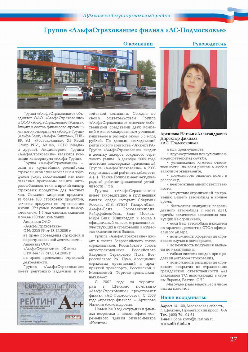 С 2002 года на территории г. Щёлково компанию «АльфаСтрахование» представляет филиал «АСПодмосковье». С 2007 года директор филиала – Архипова Наталия Александровна.