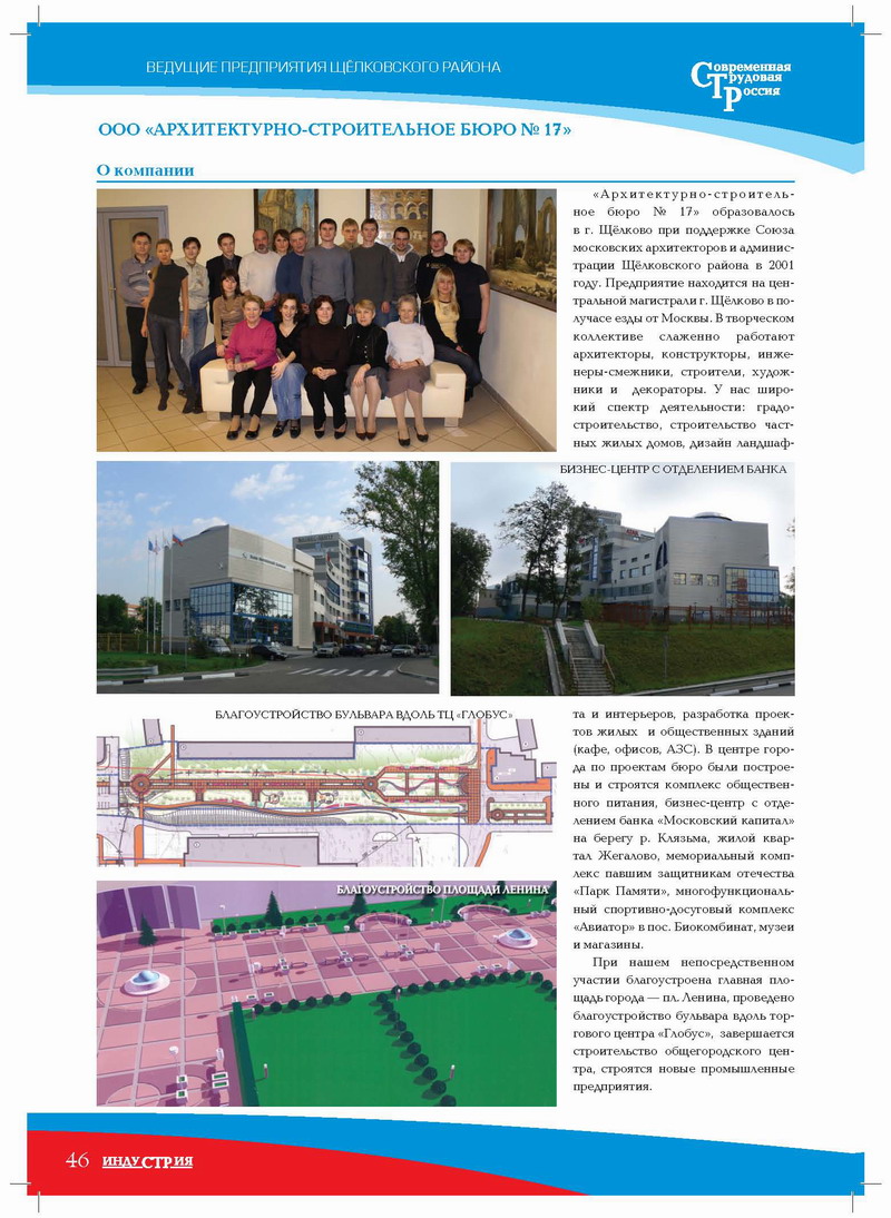 «Архитектурно-строительное бюро № 17» образовалось в г. Щёлково при поддержке Союза московских архитекторов и администрации Щёлковского района в 2001 году. Предприятие находится на центральной магистрали г. Щёлково в получасе езды от Москвы. В творческом коллективе слаженно работают архитекторы, конструкторы, инженерысмежники, строители, художники и декораторы. У нас широкий спектр деятельности: градостроительство, строительство частных жилых домов, дизайн ландшафта и интерьеров, разработка проектов жилых и общественных зданий (кафе, офисов, АЗС). В центре города по проектам бюро были построены и строятся комплекс общественного питания, бизнесцентр с отделением банка «Московский капитал» на берегу р. Клязьма, жилой квартал Жегалово, мемориальный комплекс павшим защитникам отечества «Парк Памяти», многофункциональный спортивнодосуговый комплекс «Авиатор» в пос. Биокомбинат, музеи и магазины.