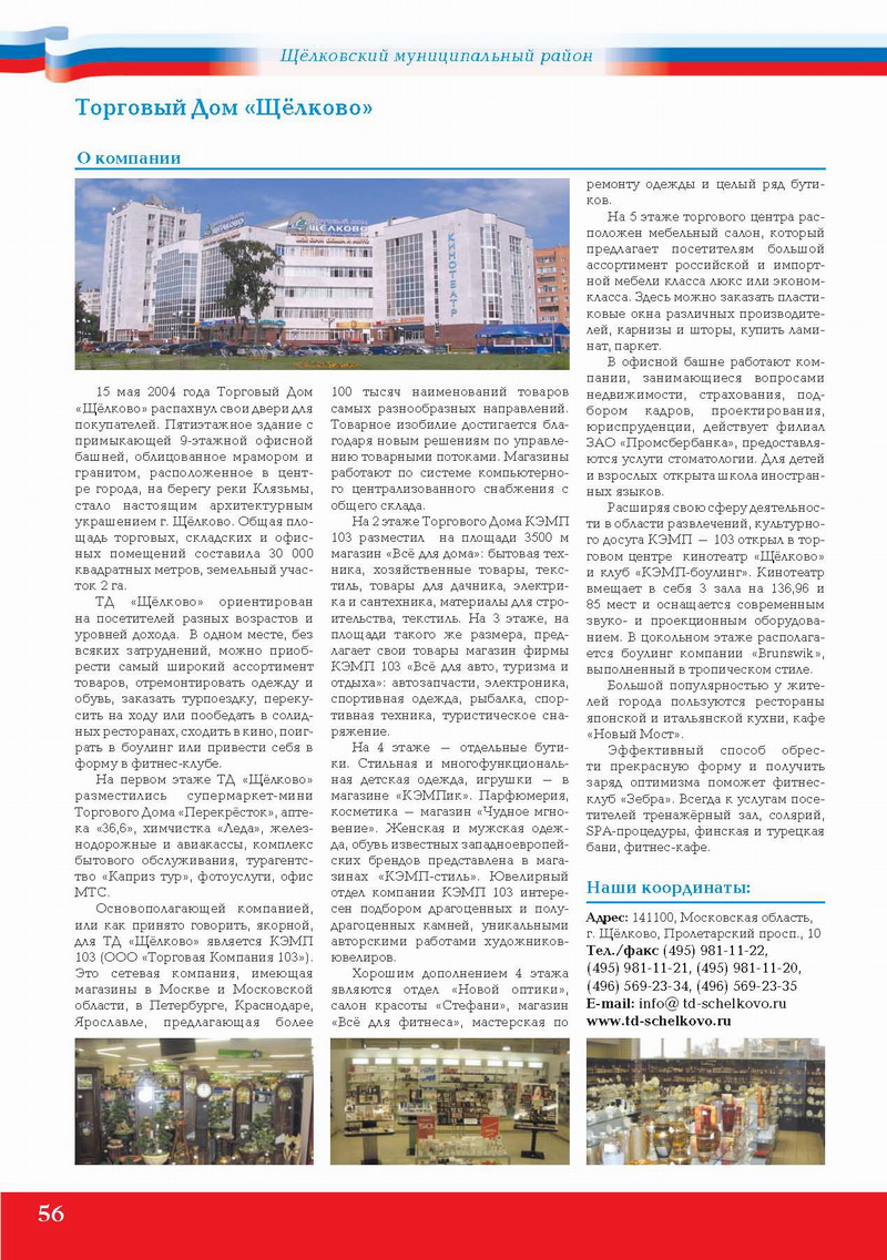 Т15 мая 2004 года Торговый Дом «Щёлково» распахнул свои двери для покупателей. Пятиэтажное здание с примыкающей 9-этажной офисной башней, облицованное мрамором и гранитом, расположенное в центре города, на берегу реки Клязьмы, стало настоящим архитектурным украшением г. Щёлково. Общая площадь торговых, складских и офисных помещений составила 30 000 квадратных метров, земельный участок 2 га.