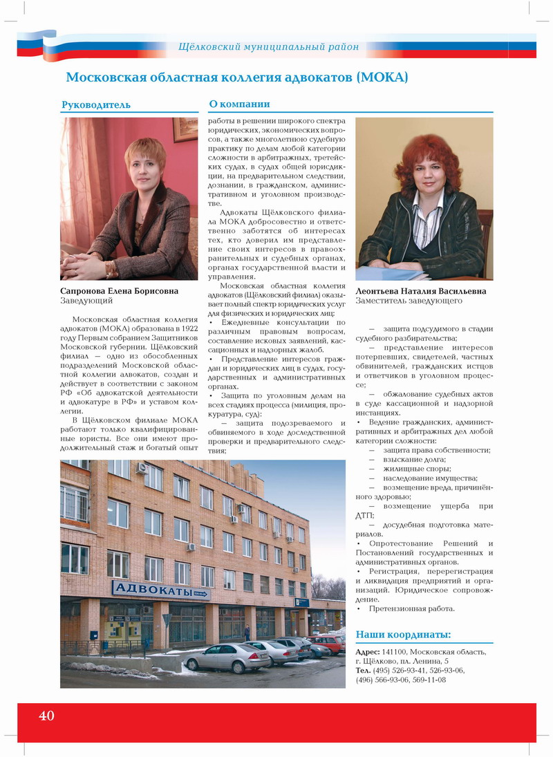 Московская областная коллегия адвокатов (Щёлковский филиал) оказывает полный спектр юридических услуг для физических и юридических лиц: