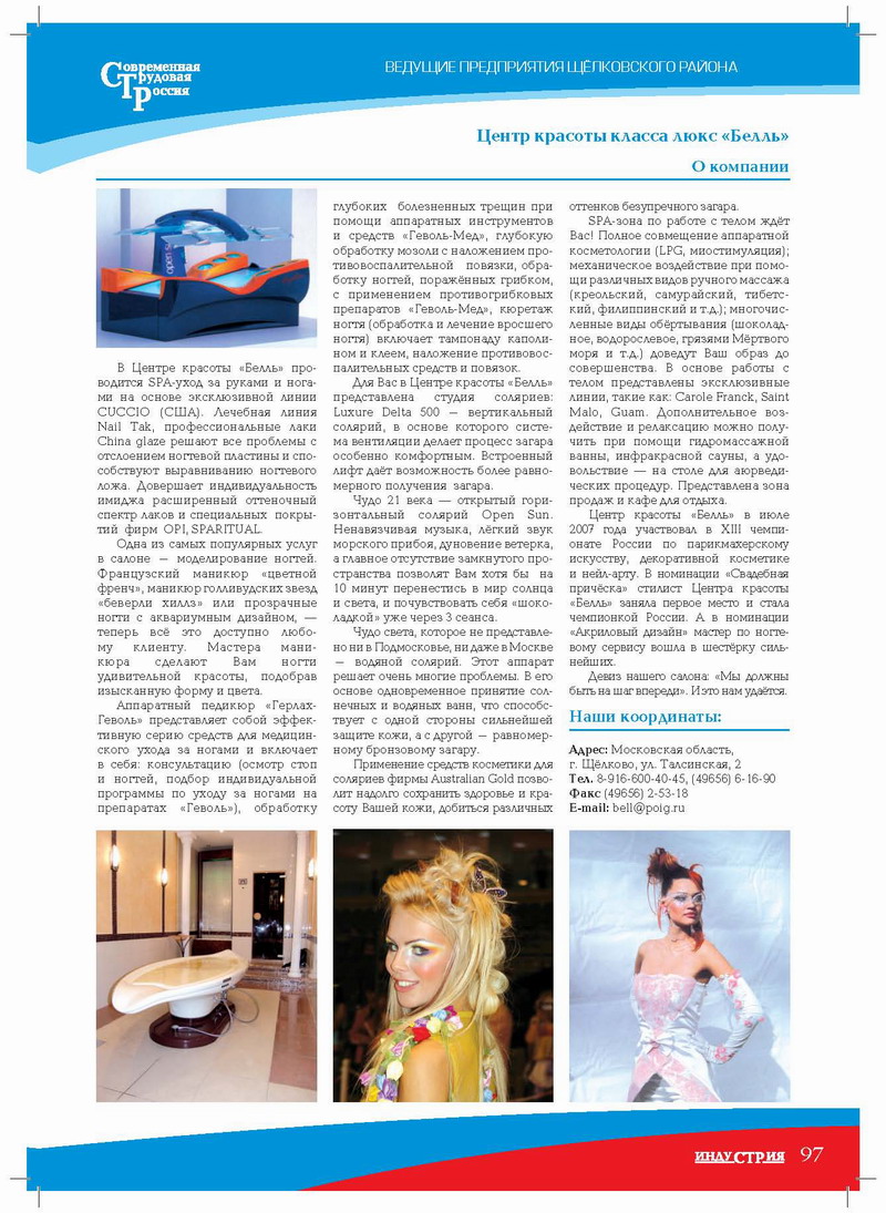 Центр красоты «Белль» в июле 2007 года участвовал в XIII чемпионате России по парикмахерскому искусству, декоративной косметике и нейларту. В номинации «Свадебная причёска» стилист Центра красоты «Белль» заняла первое место и стала чемпионкой России. А в номинации «Акриловый дизайн» мастер по ногтевому сервису вошла в шестёрку сильнейших.